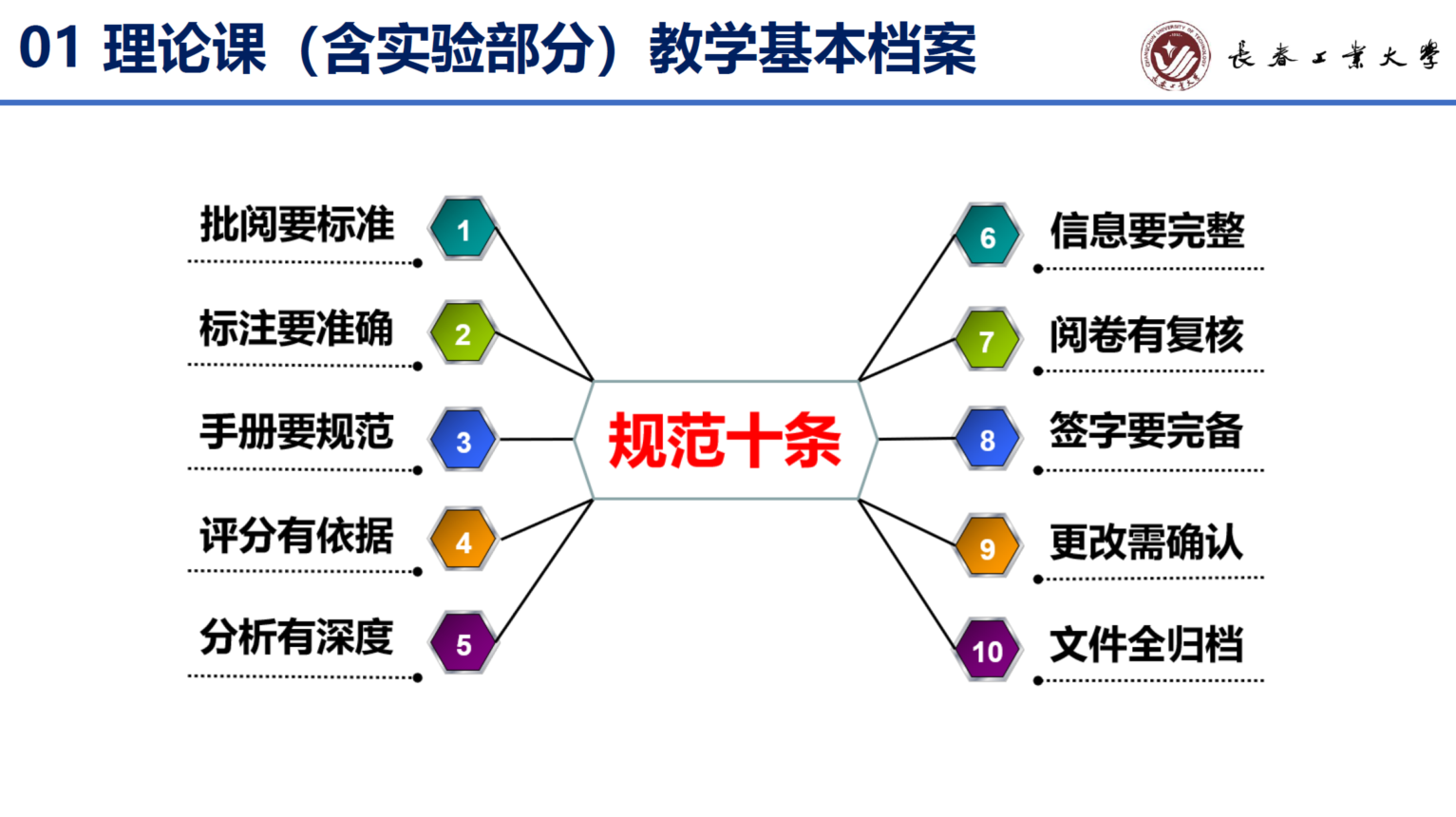 报告会的最后,于教授凝练出了批阅要标准、标准要准确、手册要规范、评分有依据、分析有深度、信息要完整、阅卷有复核、签字要完备、更改需确认、文件全归档的教学基本文档十条规范。她鼓励教师们要不断提高自身教育教学水平,积极探索教学方法改革,为提高学校的教育教学质量做出贡献。
