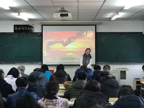 党委书记王丽娜在南湖主楼1401室以《严肃党内政治生活,净化党内政治生态》为题,为学院师生党员讲党课。教师党员、学生党员共计100余人参加。
