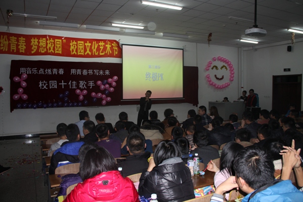 主持人宣布比赛规则后,大赛正式开始。劲爆的开场舞过后,是选手们的视频介绍,紧接着选手们进行了倾情演唱,经过了单人演唱、双人PK、终极PK、现场抽奖等四个环节后,经过评选130308班杨欢获得冠军、130306班牛凯、130301班韩春阳分别荣获亚军及季军。