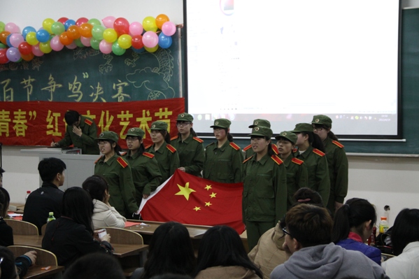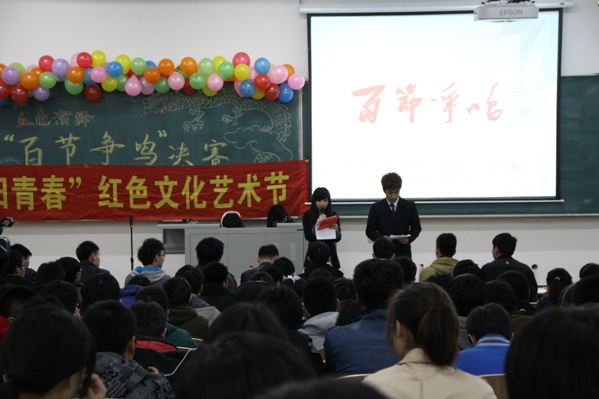 | (通讯员 夏天竺)中国传统节日是中华民族五千年的文化发展沉淀而成的一笔宝贵财富,为了弘扬中华民族传统文化,调动学生的活动积极性,展现学生的才能,发掘人才,4月21日18:00,学院在北湖校区西阶201教室举办了“朝阳青春”红色文化艺术节之“红色演绎”百节争鸣文艺展演活动。校学生会秘书长衣鑫、院学生会主席周子健、副主席邢岩、社团联合会副主席王梓源、秘书长董跃峰、舍委会主任庞文举、网络信息部部长王剑峰以及12级同学参加了此次活动。