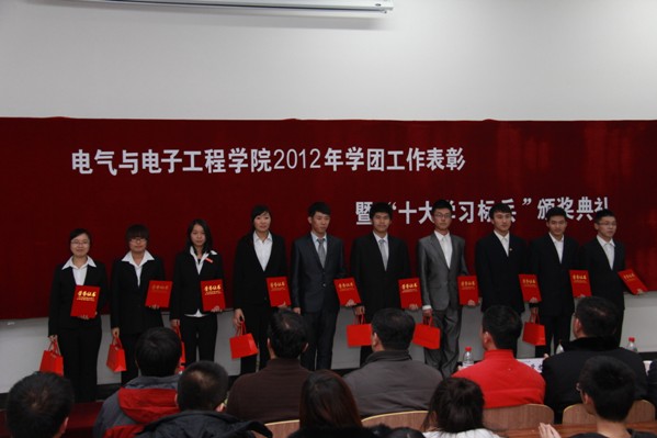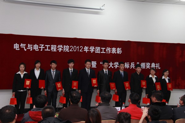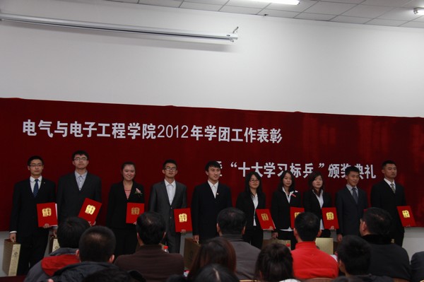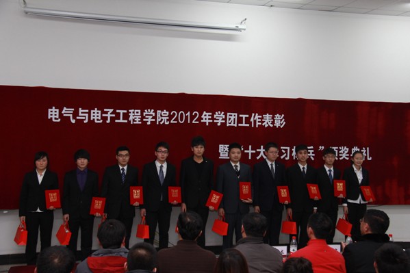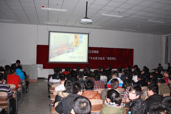 (通讯员 夏天竺 宋文全)12月14日18:00,学院在北湖校区隆重举行了2012年度学团工作表彰暨“十大学习标兵”颁奖典礼。校学生工作处副处长兼大学生就业指导中心主任杨文龙、副处长郭世强,校团委副书记常惊宇,学院党委书记张学忠,院长李元春,副院长卢秀和、姜长泓,党委副书记周文军,关工委常务副主任蒲春华等领导出席了会议。
