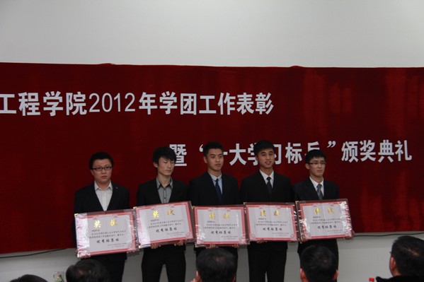 学团工作表彰的名单。大会对100302班等5个优秀班级体,赵景兴等十大学习标兵,徐月阳等29名科技竞赛标兵,李振等30名单科状元,周子健等10名学生干部标兵,王艳飞等10名优秀共产党员,郭小龙等10名文体活动骨干,张博傲等10名理论学习先进个人,刘硕等37名优秀学生干部,陈新等27名文明大学生,马鸣威等37名文体活动积极分子进行表彰奖励。与会领导为获奖集体和个人颁奖。