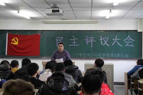 首先,郑洪斌传达了校党委组织部关于2012年度民主评议工作的安排意见,并对民主评议工作的意义做了阐述和动员。然后对支部党员民主评议工作做出具体安排,同时要求各位党员认真学习相关文件精神,对民主评议工作要高度重视。最后,支部党员逐一对每名党员做了评议。评议大会后,郑老师通报了2012年12月新发展党员的党委批复,并带领新发展党员,面向党旗庄严宣誓,以此激发新党员铭记自我身份与牢固树立实现共产主义的伟大理想。  此次评议会议,总结了学院学生党支部全体党员在过去一年的工作及表现,为党员同学在新一年中更好的发挥党员先锋模范作用提供动力。 |
