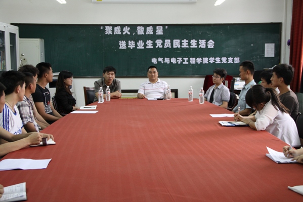 | (通讯员 周欣 高生)6月12日13:00学院学生党支部在教学主楼1303教室召开“聚成火,散成星”送毕业生党员民主生活会,学生党支部书记郑洪斌老师和支部全体党员本次活动。