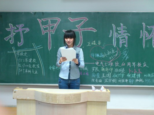 各团支部的团会活动精彩纷呈,多姿多彩,形式多样。演说、校友风采展示、校园知识竞赛、讨论、寄语、朗诵等等应有尽有。充分体现了“抒甲子情怀,迎60年校庆”的主题,展示了强大的教育功能。激发了从我做起、从现在做起、为母校争光、为班级做贡献的使命感和荣誉感。主题团会的效果很好的得到了体现。为我校60年大庆增添了灿烂的一笔。