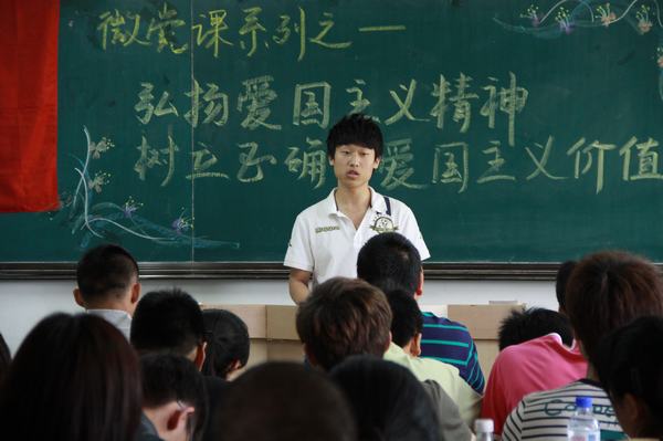活动开始,由武帅同学针对此次活动主题进行讲解,他首先讲解了什么是爱国主义,爱国主义精神是什么产生的,并通过列举先烈事迹激励我们要将其继承并发扬下去。并详细讲述了作为当代大学生的同学们应利用业余时间,增强自身的国防意识,用自己的切身行动去弘扬爱国主义精神。接下来刘博同学又向我们详细地讲解了伟大的科学家钱学森的故事。钱学森在最艰苦的时期回到了祖国,正是在强烈的爱国主义精神的驱使下,为我国的科研事业做出了巨大的贡献。刘博说,在当今的社会背景下,我们最主要的任务就是树立正确的爱国主义价值观,努力学习,为我国的科学发展贡献力量。最后,郑洪斌老师对本次活动进行了总结,对同学们能结合历史方面的知识来思考和学习进行了表扬,同时指出,理论与实践结合的重要性,并希望大家能够延伸知识面,开阔性的看问题,并能以更加饱满的热情和积极认真的态度对待每次的微党课的学习。
