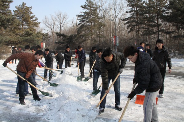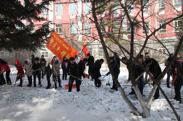 同学们积极踊跃,热情高涨,发扬共产党员不怕困难,吃苦耐劳的精神,克服天气寒冷、雪量大、路面经过踩轧不易清扫等困难,经过将近一个多小时的清扫,路面终于干干净净,没有雪迹。