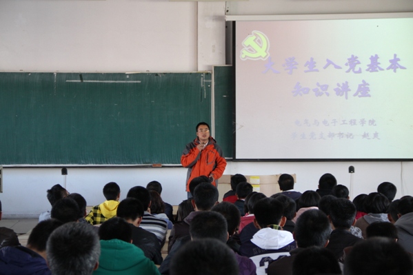我院举办大学生入党基本知识讲座 为了进一步加强大一新生教育、管理、服务工作,端正大一新生的入党动机,10月20日,我院在综合楼四楼举办大学生入党基本知识讲座,本次讲座由学院学生党支部书记赵爽主讲,学院全体大一学生参加了本次讲座。 赵老师以坚定政治方向,积极靠近党组织为主要内容讲解怎样才能入党,结合大学生实例从“一个主动、两个了解、三个突出、四个一样”为出发点,按照组织发展程序讲解大学生如何成为一名中共正式党员。在讲座最后,赵老师按照我校党委组织部发展党员具体要求和《入党培训实用教材》,讲解了如何书写入党申请书和思想汇报。