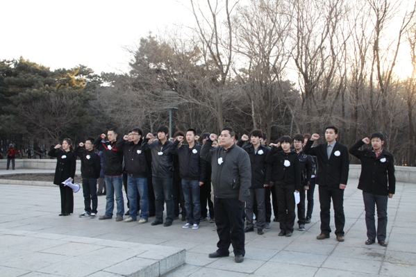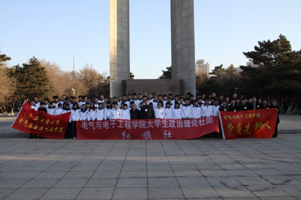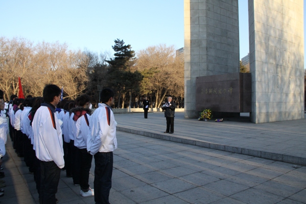 来到解放纪念碑前全体同学向革命烈士默哀3分钟,追忆先烈们的音容笑貌,缅怀先烈们的丰功伟绩,告慰先烈们的峥嵘岁月,随后党员代表为烈士们敬献白花,学生党支部书记郑洪斌老师领誓,铿锵的誓词表达了前辈们的流血牺牲不仅仅是为了让我们拥有一片晴空,呼吸自由的空气,更希望受过深重灾难的祖国在我们的手中变得更加繁荣、昌盛。随后由090305班徐乐发言,大家要牢记自己的使命,不忘先烈遗志,继承先烈们的光荣传统,最后董占武老师在总结发言时回顾了长春解放的时候艰辛历程,让同学们牢记历史,领悟先烈们的坚定信念,而这种精神也定会激励着同学们去开拓更加美好的未来。