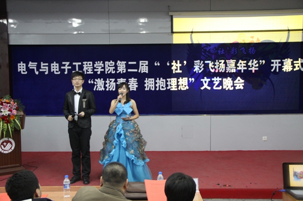 开幕式首先由学生代表吴昊同学讲话,然后由学院社团联合会主席李佳俊同学宣读“社彩飞扬”嘉年华社团文化活动安排,并且播放了学院各社团介绍视频。使同学们能够更加了解各社团的特色和活动的安排。随着矫东海老师为开幕式揭幕“激扬青春,拥抱理想”文艺晚会正式开始。