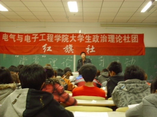 4月12日16时30分我院红旗社在南湖校区教学科研楼405教室举办党章理论学习活动,红旗社的部长以及大一各班的主要学生干部参加学习活动。活动由杨奥琪主持。 会上,王艾琪宣读了《党章》中的党的性质,申请入党条件,八项义务。随后在座各位同学,根据自己的理解对正确的入党动机进行了热烈的讨论,红旗社的理论学习的典型代表结合自身实际发表自己见解,并希望同学们刻苦学习专业文化知识,以党员的标准严格要求自己。