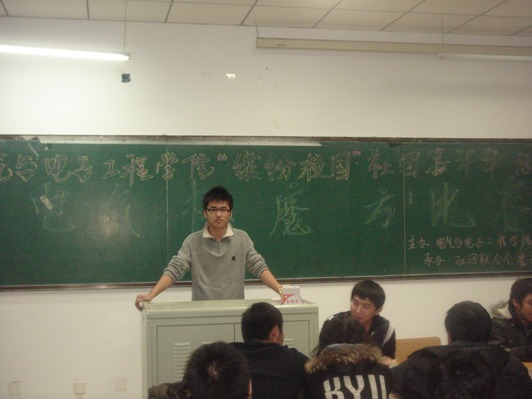 我院举行缤纷校园社团嘉年华活动之电气杯魔方比赛 为了活跃校园文化生活,12月20日 20点30分,我院在我校南湖校区教学科研楼524教室举行了“电气杯魔方比赛”,社团联合会主席朱成龙,副主席李柏蓄,魔方协会会长王禹初观看了比赛。