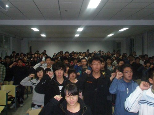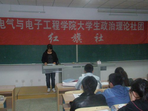 红旗社新会员入会仪式暨纪念五.四运动90周年系列活动之流金岁月爱国电影展的活动在教学科研楼314教室举行。出席该活动的有红旗社社长姜萌萌,副社长丁国,秘书长张红豆,社会实践部部长訾光大。 首先由红旗社副社长丁国宣布红旗社主要成员名单,随后由社会实践部部长訾光大宣布了红旗社的章程,接下来由红旗社秘书长张红豆宣布红旗社管理制度。最后红旗社社长姜萌萌带领全体社员做入会宣誓并发言总结了一年来红旗社的工作,并结合我校文化年活动和学院工作布置新一年的工作计划。仪式结束后,红旗社全体社员观看了《我的1919》。 |