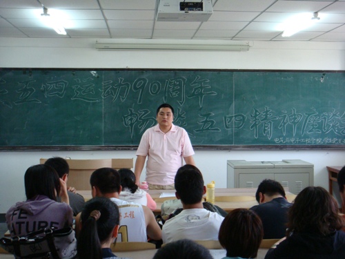 | 为纪念“五四”运动九十周年,弘扬“五四”爱国精神,5月5日中午12:40,我院学生党支部在主楼1401教室举办“庆五四运动九十周年,畅谈五四精神”座谈会。会议由学生党支部书记郑洪斌老师主持,06、07、08届学生党员、预备党员参加本次座谈会。 郑老师首先在座谈会上向大家介绍了中共中央政治局常委李长春在纪念五四运动90周年大会上的讲话。之后,他为大家讲述了他对“五四”精神的理解,并结合当前国际国家形势,提出当代大学生在和平年代应该如何弘扬“五四”精神。张福厚、朱光博等几名学生党员也就“五四”精神谈了自己的理解,同学们在融洽的气氛中互相交流和学习。在交流会的最后,郑老师也对学生党员提出几点要求并希望大家增强政治理论和专业学科方面的学习,将来为祖国做出更大的贡献。