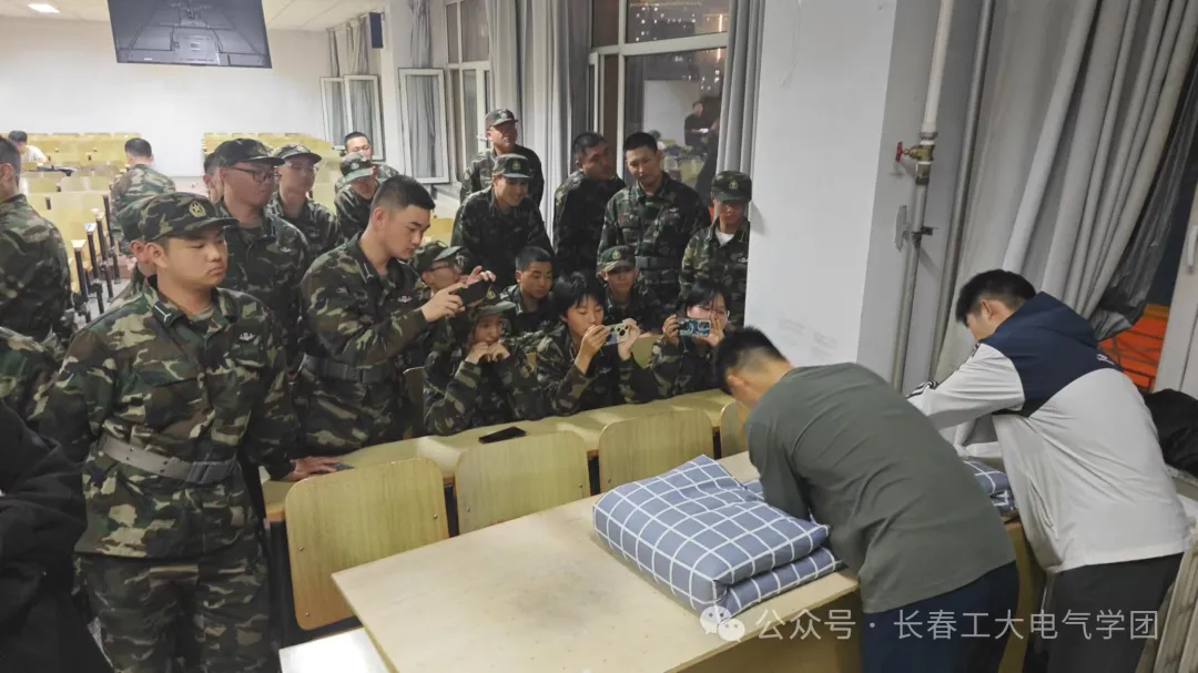 “叠被子时,要先铺平,然后对折,注意边角的对齐和压实。”学长一边熟练地操作,一边耐心地解释。同学们聚精会神地观察着,不时点头表示理解。