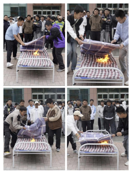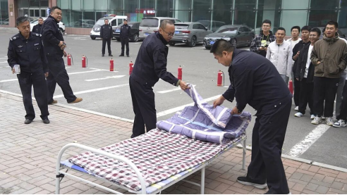 学生两人一组轮流实操,用被子覆盖火源,亲身掌握初期火灾处置技巧。