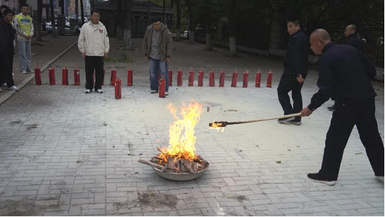 学生两人一组轮流实操,手持灭火器对准火盆火源精准喷射,成功扑灭明火。