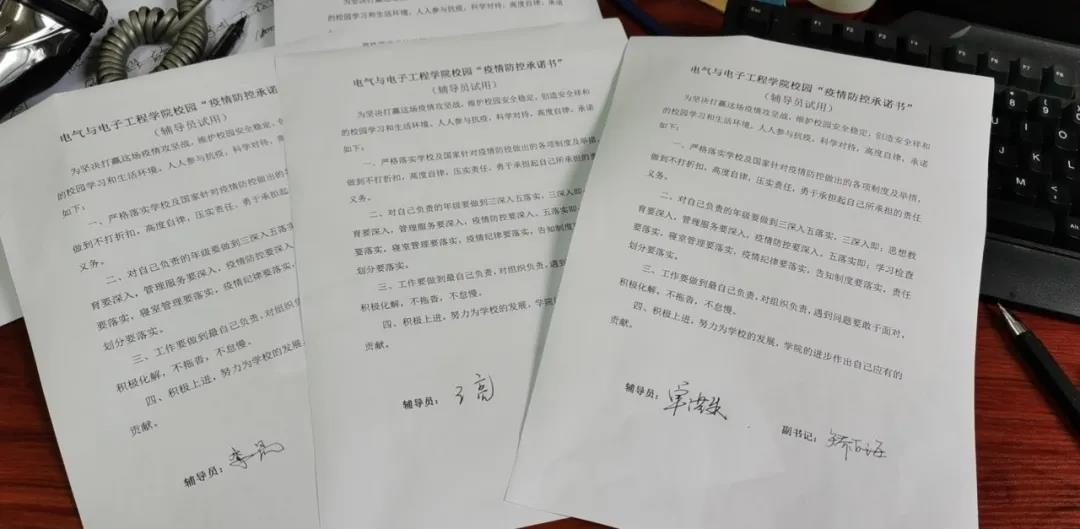 会上辅导员老师签订了疫情防控承诺书,为疫情防控下决心,众志成城,攻坚克难。