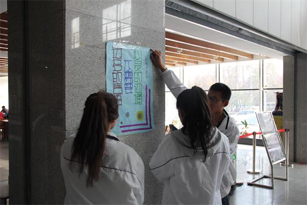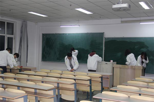 走向教学科研楼,一块写有“拒绝课桌文化,再添迎评亮色”“做好校园主人,成就素质人生”标语的宣传板吸引了过往同学的目光。10月30日,在党员先锋队的带领下,学院同学参与“教室你我他”活动,同学们进入科研楼对常用教室进行清扫,擦拭课桌上的笔迹,为大家树立了良好的典范。