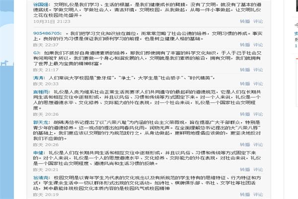 10月29日至11月2日学院团委通过官方微博、微信举办为期5天的“校园文明微博”征集活动,要求参赛的微博作品以“倡导校园文明,构建和谐校园”为主题,更加服务于学院校园文明月活动的宣传和活动宗旨。学院利用流行时尚的沟通方式在全校范围内将活动真正做到同学中去。