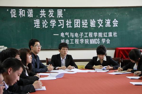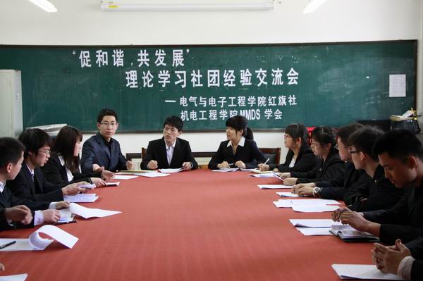 红旗社与机电工程学院MMDS学会共同主办的促和谐共发展理论学习社团经验交流会在南湖校区主楼1303室举行。红旗社与MMDS学会骨干成员出席了本次会议。