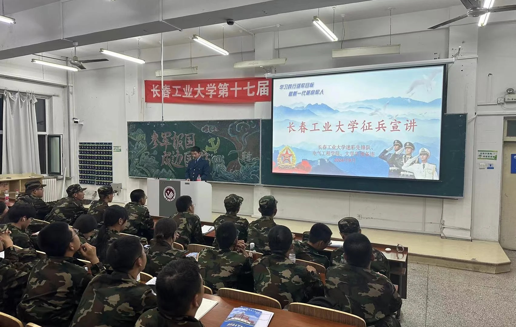 随着新学期的开始,本学院精心策划了这场征兵宣讲会,特别邀请了退伍军人代表,为大一新生们带来了一场内容丰富、意义深远的国防教育活动。通过政策解读、经验分享和互动问答,宣讲会旨在帮助新生了解国家的征兵政策,感受军营生活的魅力,激发他们的爱国情怀和报效国家的意愿。
