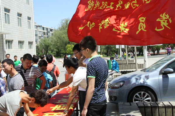 志愿者早早将写有“生命于烟草对抗”的条幅挂在食堂门前,并对世界无烟日以及吸烟的危害进行宣传。活动吸引了中午来食堂吃饭的同学们,在听过志愿者的宣传后,大家都表示愿意在条幅上签字,以表示自己对于拒绝烟草的信心,并承诺向其他同学宣传烟草的危害。