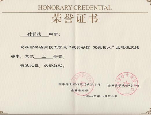 我院付朝廷获省高校大学生“诚实守信 立德树人”主题征文三等奖<