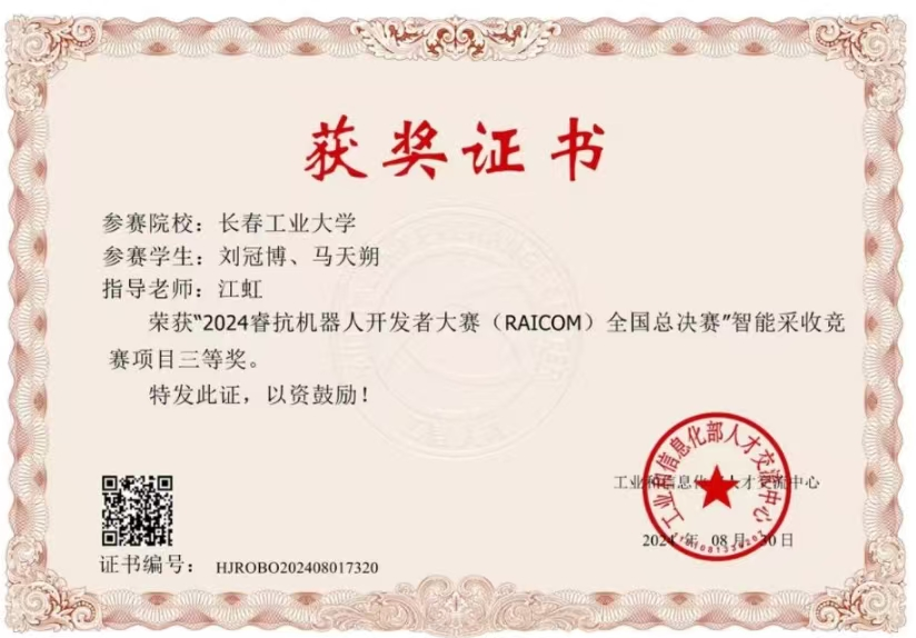 我院校学生刘冠博,马天朔荣获“2024睿抗机器人开发者大赛全国总决赛”智能采收竞赛项目三等奖