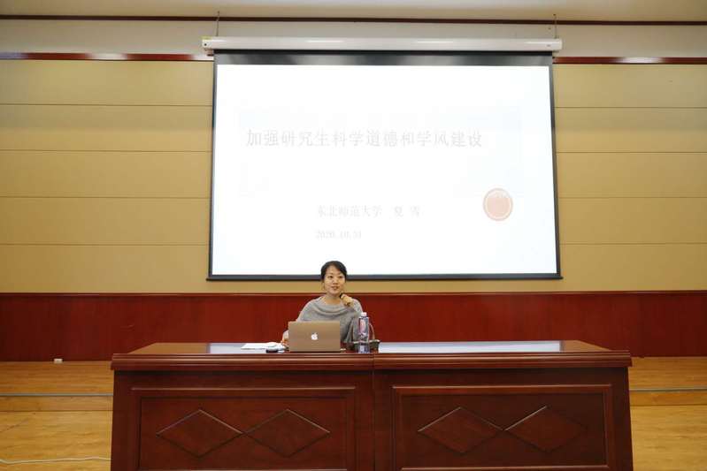 东北师范大学教育学部教育管理学院教授、博士生导师夏雪作了题为“加强研究生科学道德和学风建设”的专题报告。从研究生科学道德和学风建设“是什么”、“为什么”以及“如何加强”三个方面,指出当代研究生加强科学道德及学风建设的重要性,并引用了国内外学术不端的例子告知同学们如何正确遵守学术界的标准,切勿抄袭剽窃他人文章、一稿多投、伪造或篡改实验数据等,希望同学们高度重视科学道德与学风建设,在科研道路上不断加强自身学术道德修养,牢记新时代高层次人才身上的重任,要坚守学术诚信,维护学术尊严,摒弃学术不端,以优良的学风全身心投入到学习和科研事业中。