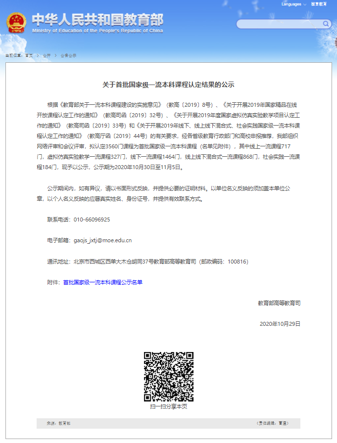 2020年10月29日,教育部高等教育司发布《关于首批国家级一流本科课程认定结果的公示》,我院计算机控制系统课程被认定为首批国家级本科线下一流课程。