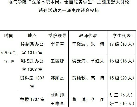 为使学院教师立足于本职岗位,提高学院服务学生质量,并结合我院干部作风大整顿的具体要求。学院于2018年9月14日召开“立足本职本岗、全面服务学生”主题思想大讨论系列活动,学院领导班子成员分别参加了本科和研究生的师生座谈会。