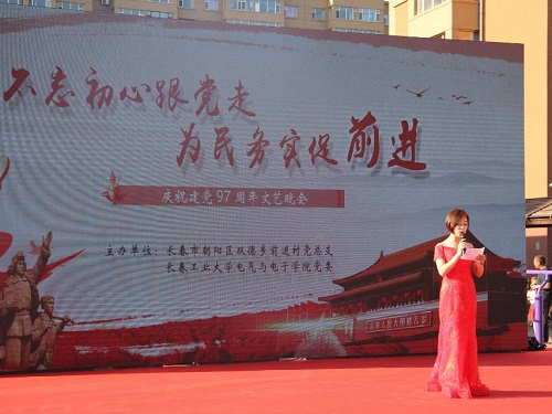 新闻网讯(通讯员 钱力为)为庆祝中国共产党建党97周年,2018年6月21日下午5时,由中国共产党长春市朝阴区双德乡前进村总支部委员会,联合我院党委共同举办的“不忘初心跟党走,为民务实促前进”建党97周年文艺晚会在繁荣小区隆重举行。双德乡党委书记吴树清、双德乡党委副书记肖琨、前进村党总支书记刘忠莅临晚会现场,我院团委副书记娄婷婷出席晚会现场。