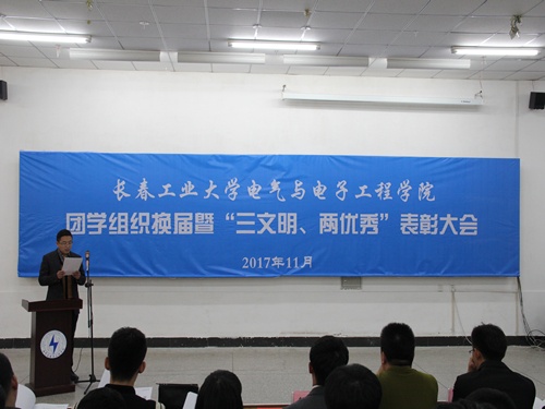三文明,两优秀的表彰决定。学校学院领导分别对文明班级、文明寝室、文明大学生、文体活动之星、优秀学生干部、优秀编辑团队、优秀文艺团队、优秀运动团队、优秀理论实践社团进行颁奖并合影留念。大会最后,院党委副书记矫东海向受到表彰的个人与团体表示了祝贺,并报以最衷心的期望,他在讲话中向全体成员提出“优秀是一种习惯”的工作要求,并希望在座学生干部能够戒骄戒躁、继续前行;在团学工作中继承校院优秀传统,充分发扬电气精神,为校院的发展做出自己的贡献。