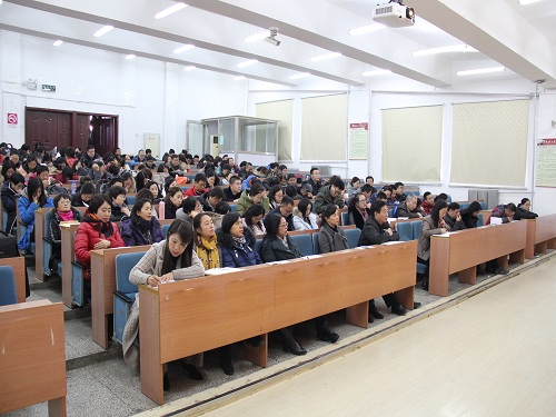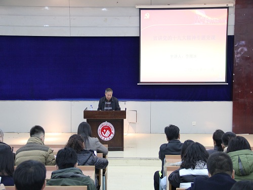 于南湖校区综合三教室举办宣讲党的十九大精神专题党课。本次党课由校党委副书记李雁冰主讲,学院全体教工党员,14、15级学生党员及部分入党积极分子参加本次党课。