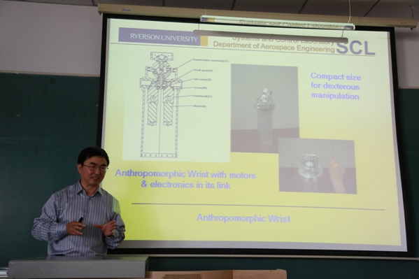 | (通讯员 卢秀和)2012年6月25日,加拿大瑞尔森大学航天工程系控制系统与机器人技术研究会主席刘光军教授应学院的邀请,在教学科研楼507教室做了“多工作模式下的模块化可重构机器人设计与控制”专题学术报告。学院部分教师和全体研究生参加了报告会,会议由主管研究生工作的卢秀和副院长主持。
