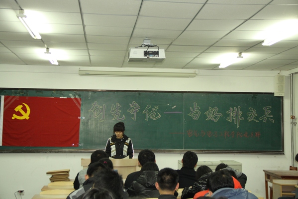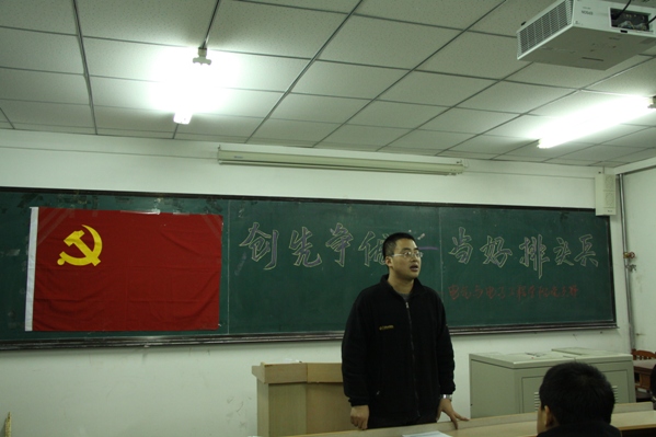 我院学生党支部举行“当好排头兵”为主题的理论学习活动 按照学院党委的部署,积极推进创先争优活动的开展。12月1日下午16:00,我院学生党支部在主楼1403教室召开主题为“当好排头兵”理论学习交流活动,本次活动由学生党支部书记赵爽老师主持。