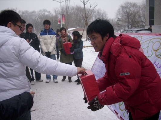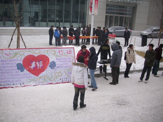 爱心志愿者协会为卫亚军同学献爱心的倡议书。原本行色匆匆的行人渐渐慢下了脚步,驻足在宣传板前加入到为卫亚军同学的捐款活动中。不少参加募捐的同学向爱心协会的会员们打听着卫亚军的身体状况,并委托他们带去自己对卫亚军的祝福。风雪中,爱心协会的会员们怀抱着募捐箱分站在宣传板的两侧,面颊冻得通红。10元,20元,50元,甚至100元,两个募捐箱在师生们的爱心捐赠下愈然渐满。有的同学甚至将自己兜里所有的钱都捐赠出来。“虽然我并不认识他,但我知道他曾生活在我们的身边,我们只是想尽自己的绵薄之力去帮助他”一位刚刚捐完款的同学对记者说到。“这是我们为卫亚军同学的爱心捐款,”一位同学代表校心理协会将860元捐款放到募捐箱里。卫亚军曾是校心理协会的成员,在得知他的病情后,校心理协会也积极组织了为卫亚军同学的捐款活动。正在举办感恩节签名活动的校勤工助学委员会在听说卫亚军的情况后,也利用自己的音响设备帮助宣传募捐。“感恩的心,感谢有你”,在《感恩的心》的乐曲声中,食堂门前的工大学子爱心涌动,短短的一个多小时,“爱心行动”共募捐到现金3290多元。