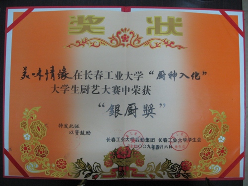 院社团联合会认真组织,同学们积极参加,由宋龙、付丛杉、张春亮、王娟四名同学组成“美味情缘”队脱颖而出获得了代表学院参加学校比赛的资格,四名同学认真准备,查阅相关资料,咨询亲戚朋友,在学校的比赛中四位选手沉着冷静,手艺高超,最后凭借“耳面清风”和“亲合相依”两道菜荣获银厨奖,为我院争得荣誉。