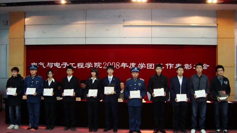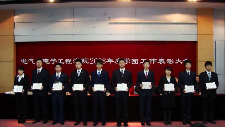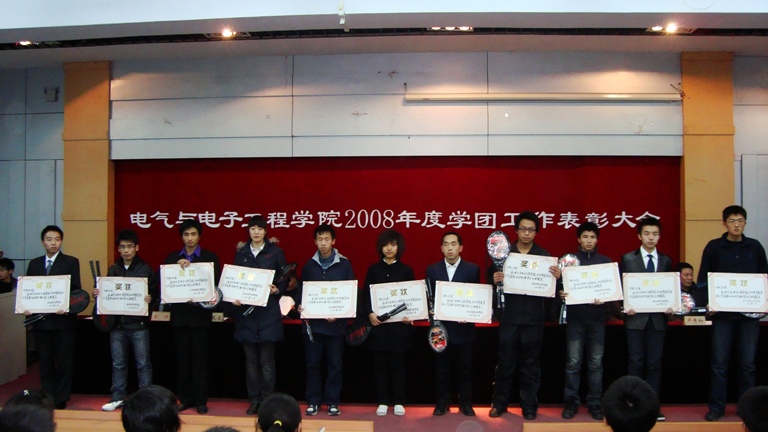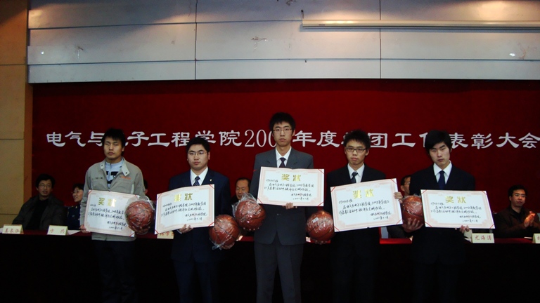 学团表彰活动的决定》,学院对060312班等5个文明班级,5栋308等17个文明寝室,姜鸣燕等十佳优秀大学生,刘健等十佳自强自立大学生,姜雪等10名优秀学生党员,赵皆鹤等40名优秀学生干部,王红等10名优秀学生团干部,李健等40名文明大学生,姜萌萌等10名学团活动优秀组织个人,于丹等40名文体活动积极分子,郭晋男等10名理论学习先进个人,朱光博等5名宣传报道先进个人,董丰嘉等10名优秀大学生志愿者,王煜琪等17名优秀寝室长行表彰奖励。与会领导为获奖的集体和个人代表颁奖。 院长尤文教授发表了讲话。尤院长首先代表学院党政班子对获奖的集体和个人表示了热烈的祝贺,并对各位领导的光临,特别是一直以来对电气学院学团工作的大力支持表示了衷心的感谢。同时对学院的学团工作和全体大学生提出希望和要求:希望学院政工干部能够认真学习实践科学发展观,坚持以生为本,将学团工作与学院人才培养的具体实际结合起来;希望受表彰的集体和个人珍惜荣誉,再接再厉,真正发挥典型、榜样的示范作用,把好的思想作风、好的学习方法、好的成功经验带给广大同学,在全院学生中形成“人人学习先进、人人争创先进”的良好氛围,带动广大同学共同成长、成才;希望广大同学一定要珍惜大学的美好时光,坚持勤奋求实、刻苦钻研、勤于实践、乐于创新的学习精神,科学制定学习目标,科学有效地进行学习,争做学习的表率,创建优良学风;希望广大同学全面锻炼和发展,面对金融风暴带来的前所未有的就业压力,同学们不但要勤奋学习,更要把握好各种锻炼的机会,积极参加各项有益的学习实践活动,在活动中锤炼自我、挑战自我、全面提升自身抗挫能力、社会适应能力和核心竞争力,做有理想、有道德、有文化、有纪律的全面发展的大学生。会上,张福厚同学代表受表彰的集体和个人表态发言。 表彰大会在热烈的气氛中落下帷幕。
