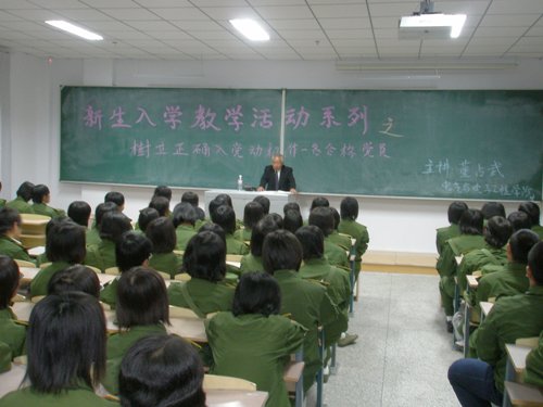 | 9月23日晚6:30,我院关工委常务副主任董占武在教学科研楼316教室为全体新生做了一场主题为“树立正确的入党动机,争做合格党员”的报告,学院辅导员赵爽、高博及全体08级新生参加此次报告会。报告会由辅导员赵爽主持。 报告中,董书记主要从什么是正确的入党动机,什么是非正确的入党动机和如何用一名党员的标准来要求自己使自己成为一名合格的共产党员三个方面进行了详细的阐述。为此,董书记还根据自己多年担任学院党总支书记的经验,结合实际讲解了正确入党动机的必要性,要把自己的理想和我党的最终理想紧密的联系在一起,只有这样才能不辜负党和国家对大学生的期望。最后,董书记还希望所有的新生同学结合我院的办学特色,在大一期间打好基础,尽快的适应大学生活的节奏,认真践行“爱国敬业、求实创新”的校训,成为一个对社会有贡献的人。 董书记的报告生动且理论性较强,为新生同学树立正确的入党动机指明了方向,激发同学们积极向党组织靠拢的决心和认真学习党的重大理论、知识的热情。  |