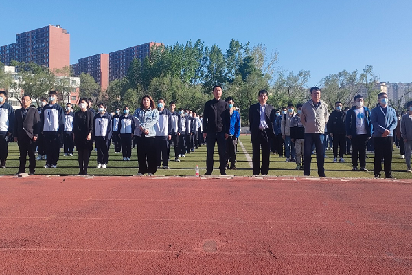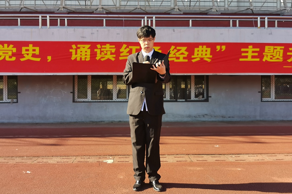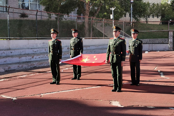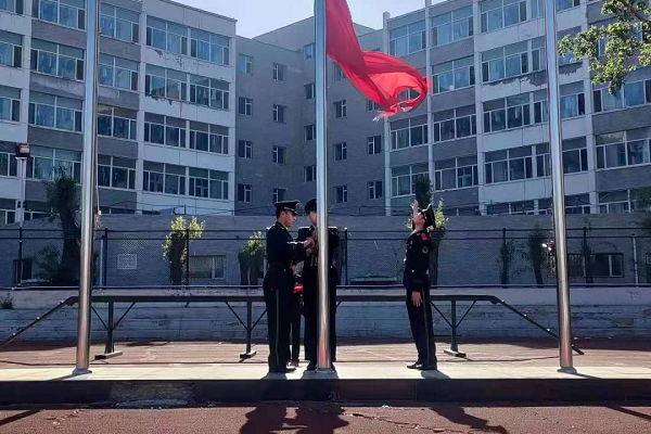 升旗仪式由四名退役大学生担任护旗手,伴随着雄壮的国歌声,在同学们的注视下,五星红旗缓缓升起,迎风飘扬。“青马班”优秀学员卢子旗,代表学生在国旗下承诺,所有同学将继续努力,加强对党史的学习与感悟,用自己的知识和行动为国家的文明富强添砖加瓦,为民族复兴贡献青春和热血。