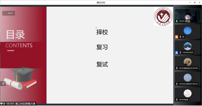 黄江林同学考入湖南工业大学,他为分享了在择校时所遇到的问题和解决办法,并分享了自己高效的复习方法。李新伟同学考研调剂回到本校,他分享了在考研学习过程中自己总结的一些经验和方法,同时也提醒同学们要结合自己实力合理报考学校和专业。