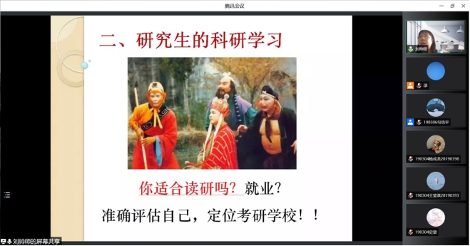 会议开始,由主持人勾浩宇同学介绍此次会议的大体内容和目的,在大家的热切期盼中,刘院长详细介绍了近三年本学院研究生招生、报考和录取等情况,六位受邀优秀毕业生依次分享了自己的保研、考研和就业的宝贵经验。