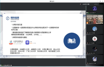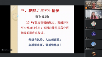 会议伊始,朱宏殷老师简明介绍了本次会议的主旨和参会人员,在大家的热切期盼中,刘院长详细介绍了近三年本学院研究生招生、报考和录取等情况,8名受邀优秀毕业生依次分享了自己的实习、就业、考研和调剂等宝贵经验。